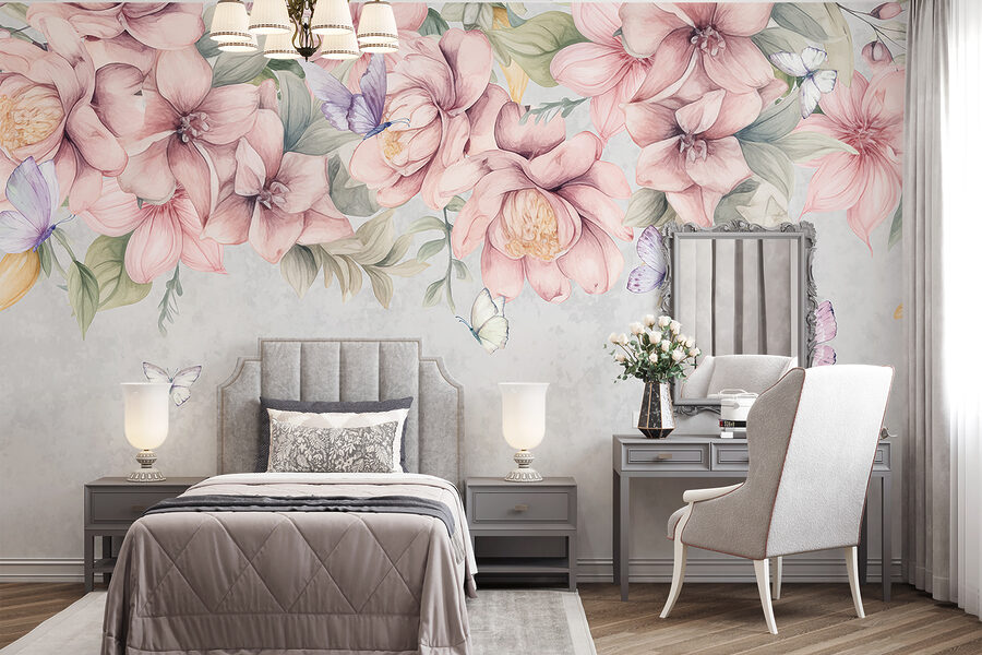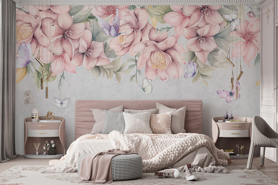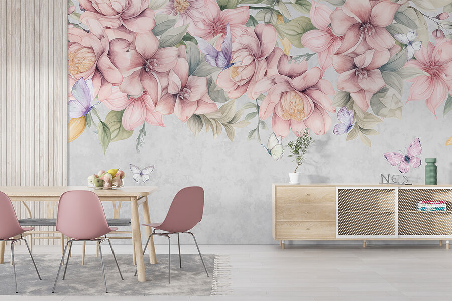 Transform any space into a tranquil garden retreat with this stunning mural, “Butterflies Rest Among Lush Blooms.” Imagine stepping into a room that invites nature right in—soft pink flowers and delicate butterflies dance across the walls like a scene from a gentle spring day.