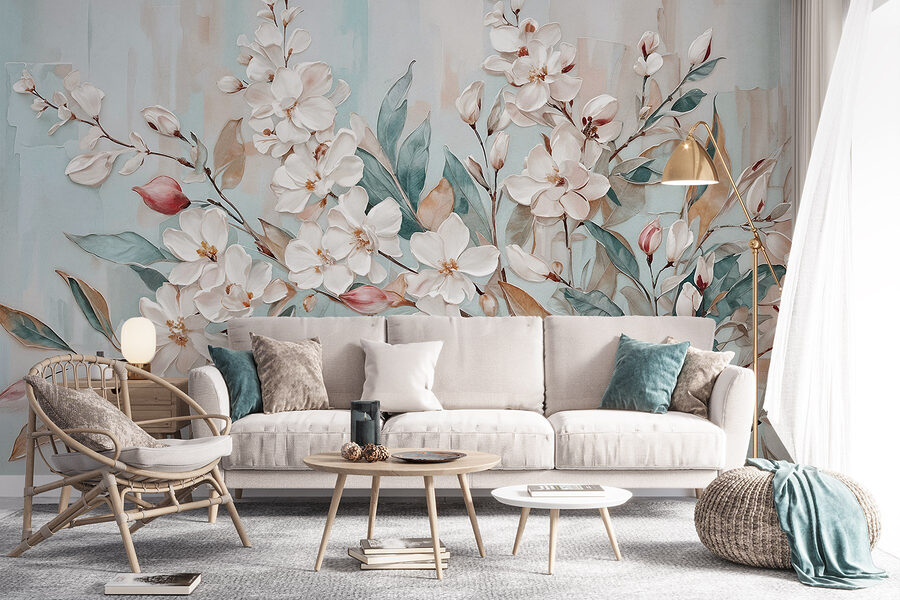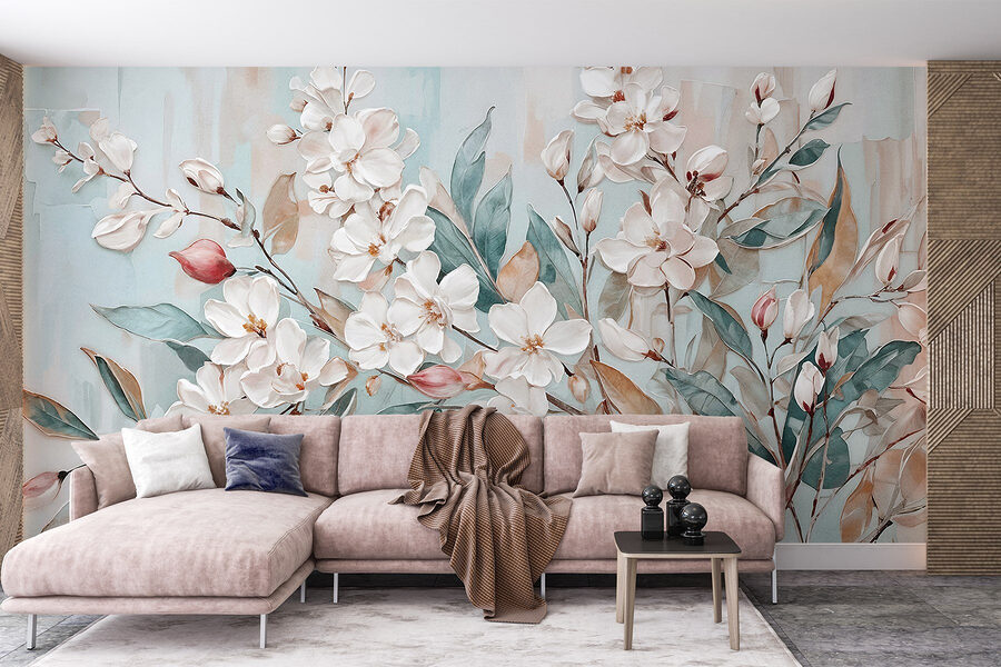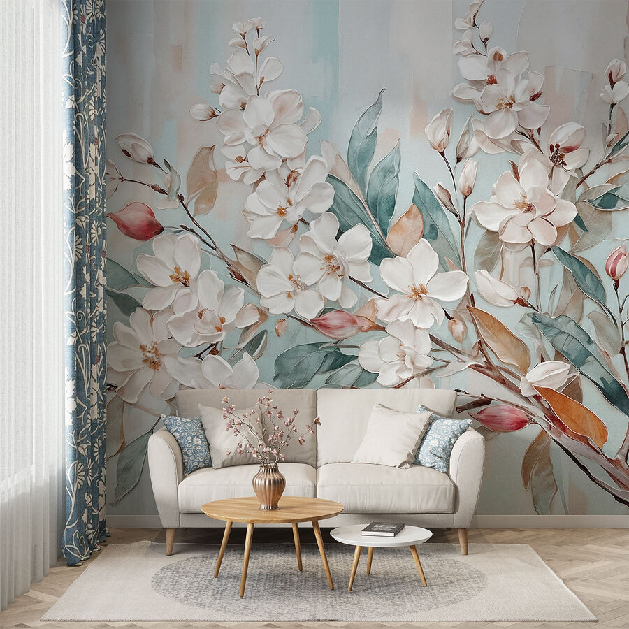 Transform your space with this stunning wall mural—a symphony of flowers dancing against a soothing blue backdrop. It’s like a breath of fresh air right in your living room! Imagine sipping your morning coffee, surrounded by these elegant blooms, as if nature itself decided to drop by for a chat. The soft petals and leaves bring a touch of serenity and warmth, inviting conversations and daydreams.
