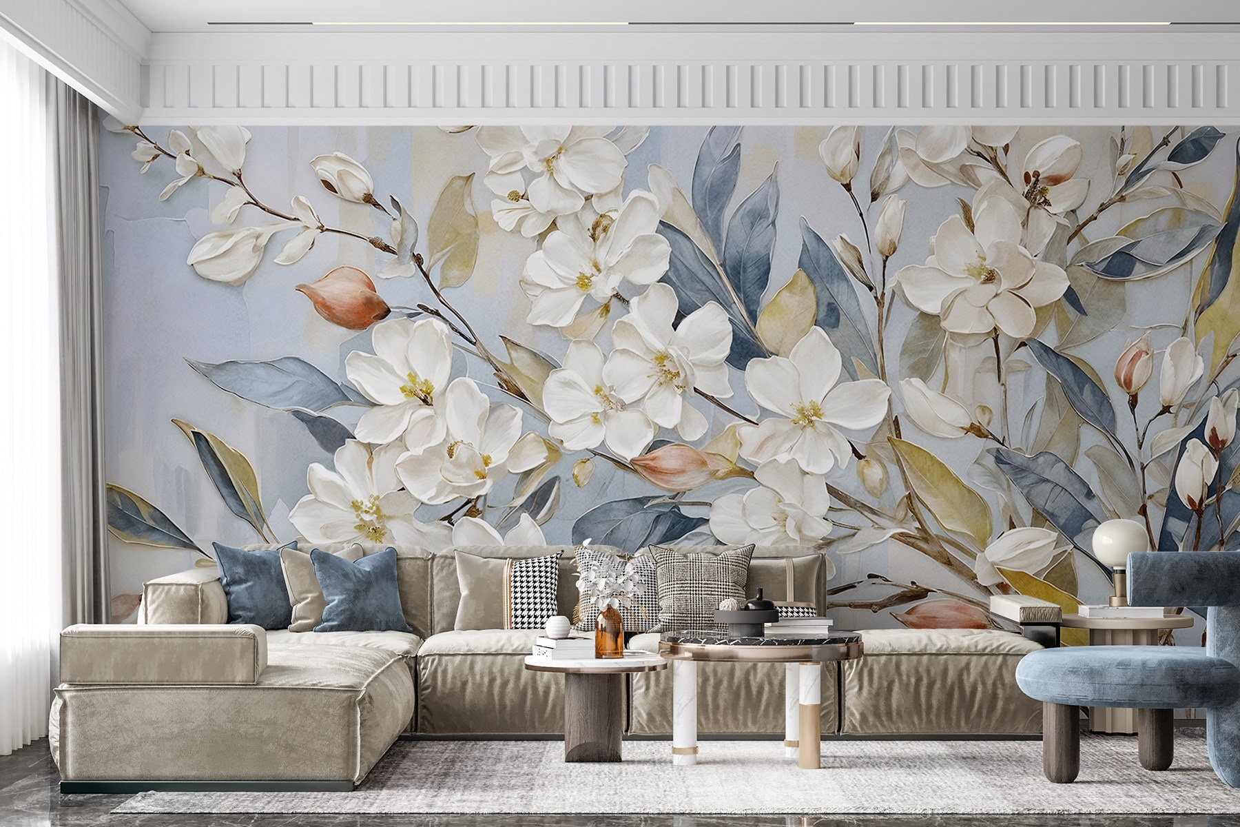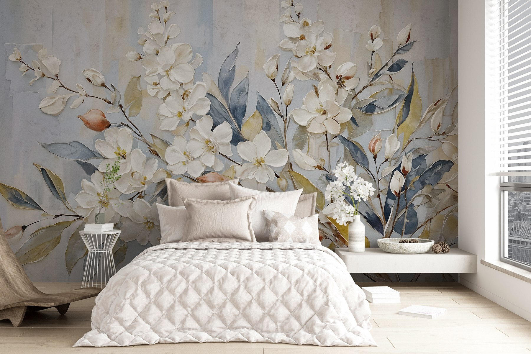 Transform a plain wall into a blossoming paradise with this stunning mural of white flowers and leaves. Imagine stepping into a room that feels like a serene garden—every glance at these delicate petals almost whispers, “Breathe in the beauty.” The soft colors are like a gentle hug, inviting calm and joy. Perfect for cozy nooks or a bright living room, it feels like nature’s artwork has come inside. Friends might even ask how you’ve managed to capture spring—oh, the secret of this mural! It’s a little slice of tranquility right at home.