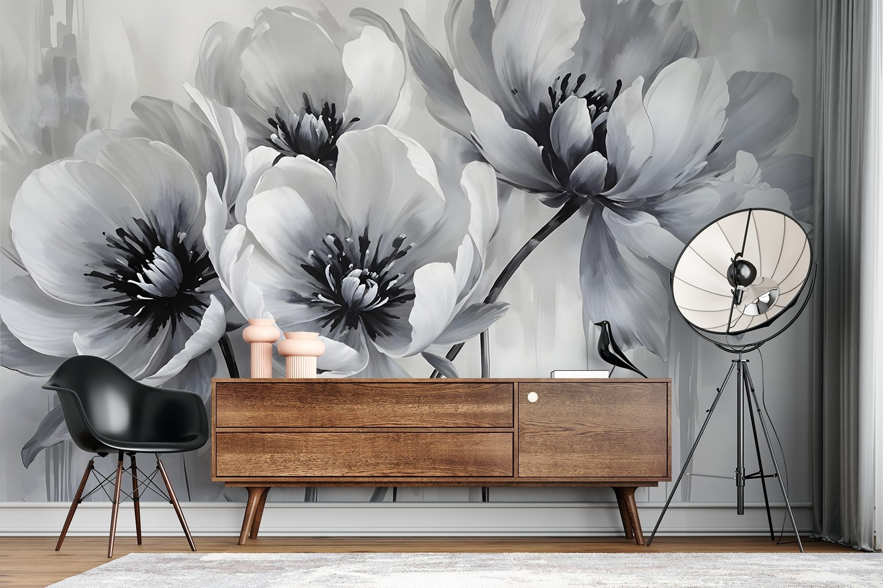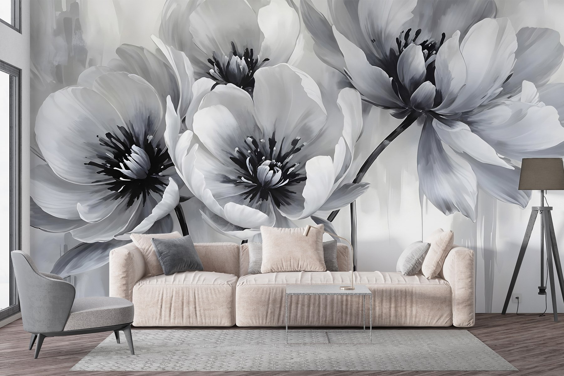 Transform your space with this stunning wall mural featuring a group of elegant flowers against a crisp white backdrop. It’s like bringing a serene garden inside without the pollen! Each petal, painted in soft shades of gray, dances with light, creating a dreamy atmosphere. Imagine curling up with a book or sipping your favorite drink while soaking in this beauty. It’s not just decoration; it’s a conversation starter. Perfect for those moments when you want a little nature in your life, minus the mud. Plus, who wouldn’t want to impress their guests with floral flair?