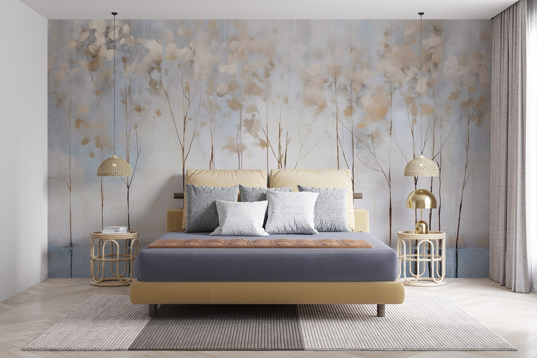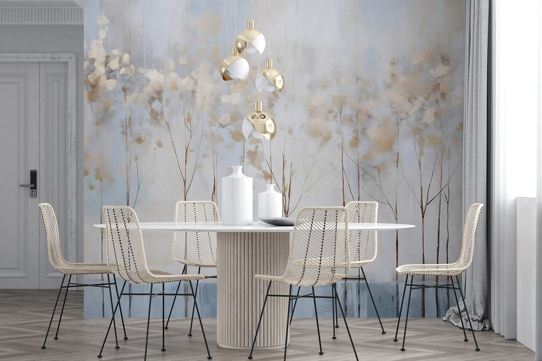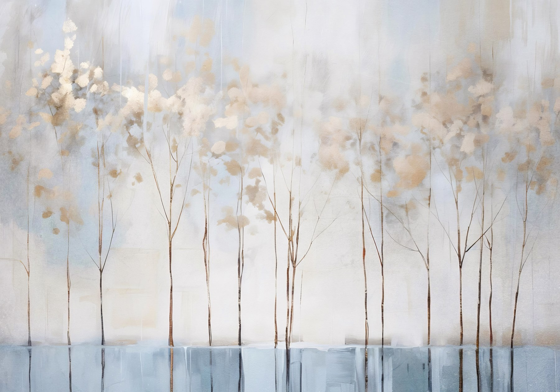 Transform your space with this enchanting mural, “Wall Murals Painting of Trees in a Row.” Imagine walking into a room where soft, muted colors swirl together, evoking a sense of calm. The delicate trees stand tall, their whispers of foliage creating a serene backdrop that could almost make you forget about that pile of laundry in the corner.