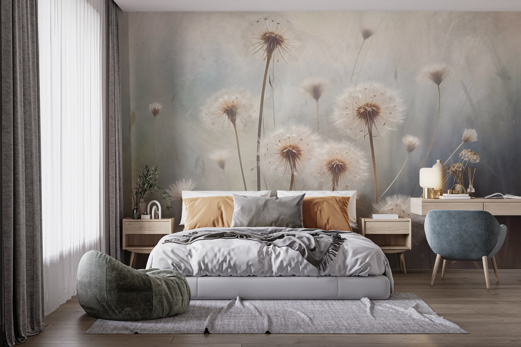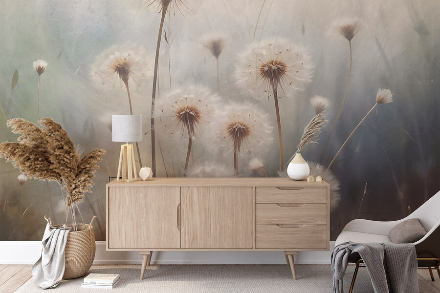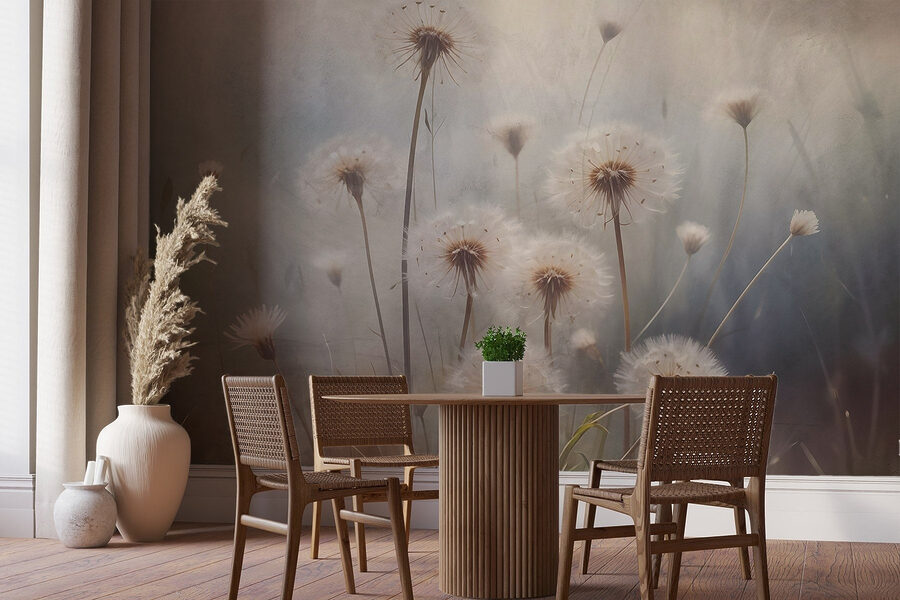 Transform a plain wall into a dreamy escape with this stunning mural featuring delicate white dandelions in bloom. Imagine walking into a room filled with soft sunlight, where these ethereal blooms almost seem to whisper secrets of nature. Each puffball captures a moment of stillness, making it perfect for a cozy reading nook or a calming bedroom retreat. Friends might stop by, do a double take, and ask if you’ve got a secret garden growing indoors. It’s like bringing a piece of the outdoors in—minus the bees, of course! So, why not let these dandelions dance across your walls, inspiring daydreams and cheerful vibes?