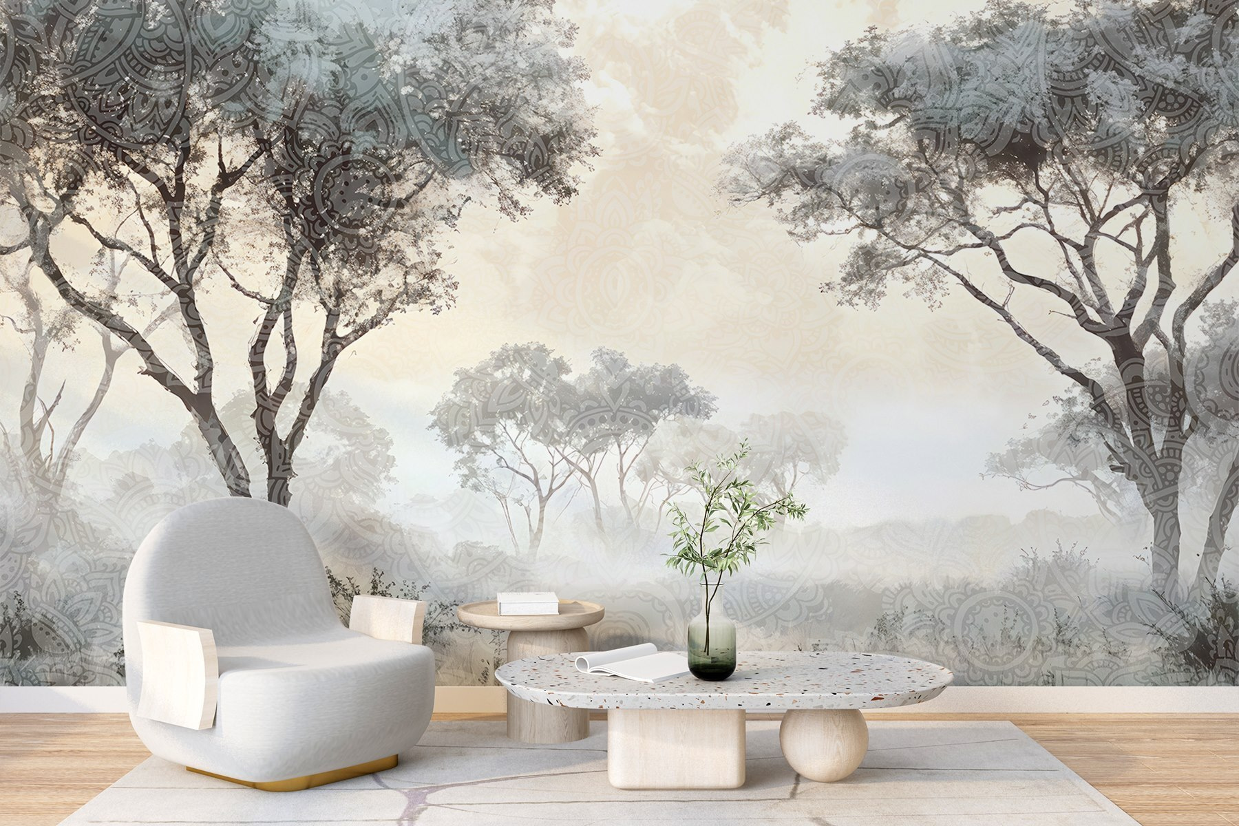 Transform your space into a serene escape with this “Foggy Landscape with Trees and Plants” mural. Imagine stepping into a dreamy misty forest every time you walk into the room. The soft hues blend effortlessly, creating a calming atmosphere that practically whispers, “Take a break.” Perfect for a cozy reading nook or a tranquil bedroom, this mural brings a touch of nature inside without the bugs. Hanging it is like inviting a gentle breeze into your home—who needs open windows? So, get ready to bask in the beauty of the outdoors, minus the rain!