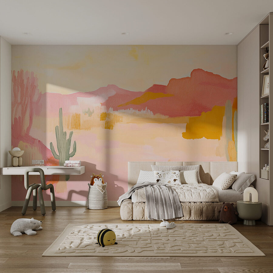 Transform any room into a sun-soaked oasis with this stunning desert landscape mural. Imagine walking into your space and instantly feeling the warmth of golden sunsets, soft pastels, and peaceful cacti—like a mini vacation right at home. It’s not just a wall covering; it’s a vibe. The playful brush strokes invite a sense of tranquility, perfect for those chill evenings or lively gatherings. Whether it sparks daydreams of desert adventures or just makes for a great backdrop for selfies, this mural adds an artistic touch that effortlessly brightens a room. Plus, it’s a conversation starter—because who wouldn’t want to chat about that stunning desert view?