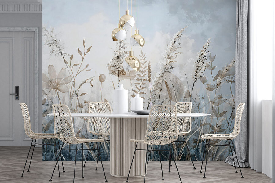 Transform your space with this enchanting wall mural featuring the delicate dance of flowers and plants. Imagine waking up to this serene garden scene, where soft hues of beige and blue whisper tranquility into your mornings. It’s like having a gentle breeze in your room—no need for a green thumb here! Perfect for a cozy living room or a zen-like bedroom, this mural invites nature’s beauty indoors. Whether you’re daydreaming over coffee or unwinding with a book, these blossoms create an atmosphere that feels both fresh and timeless. Who knew a wall could be such a mood booster?