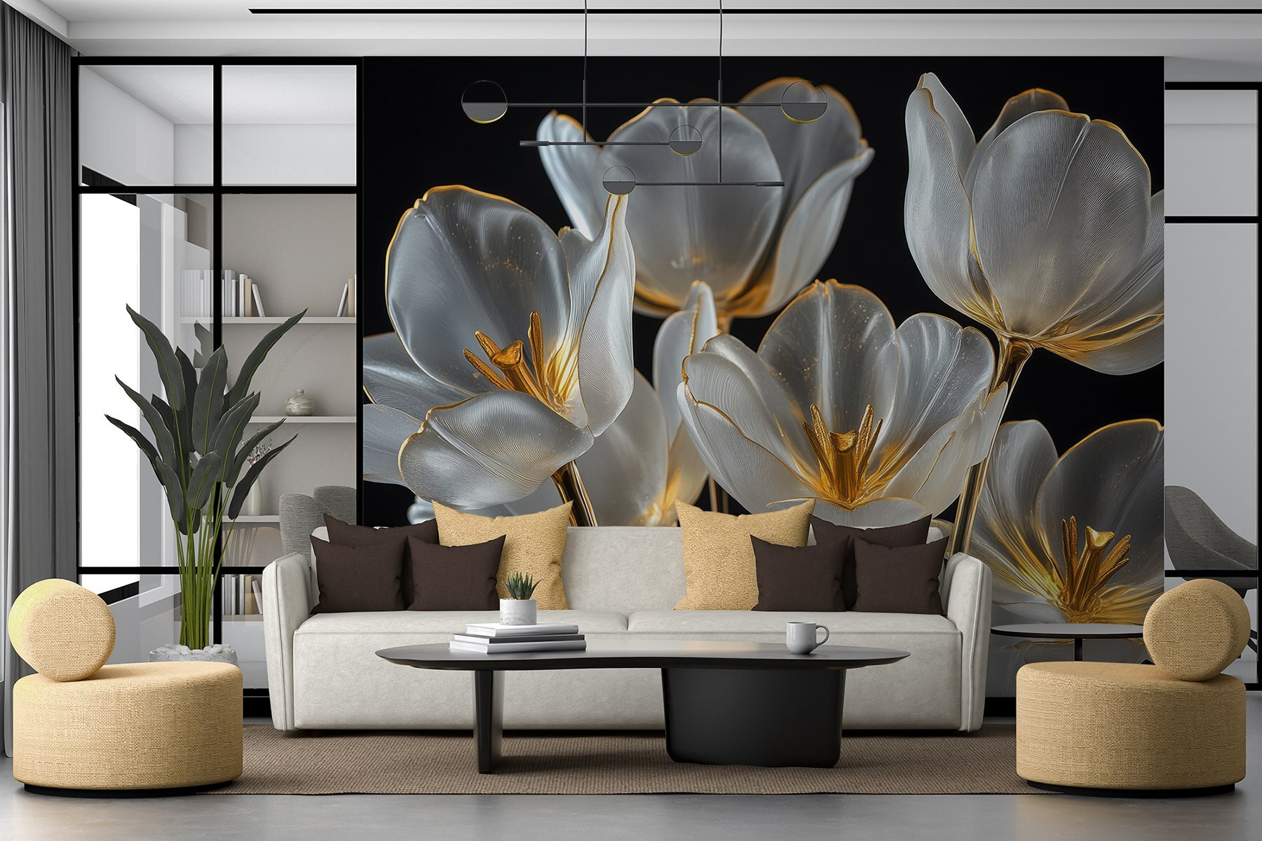 Transform your wall into a blooming masterpiece with this stunning mural featuring a group of glass flowers. Imagine stepping into a serene garden, where delicate petals look almost magical against a dark backdrop. It’s like the flowers are inviting you to take a moment of calm. Perfect for a living room or a cozy nook, this piece adds a touch of nature’s beauty without the fuss of watering. Plus, it sparks conversations—everyone will want to know where that captivating mural came from! So, why not let your walls tell a story of elegance and wonder?