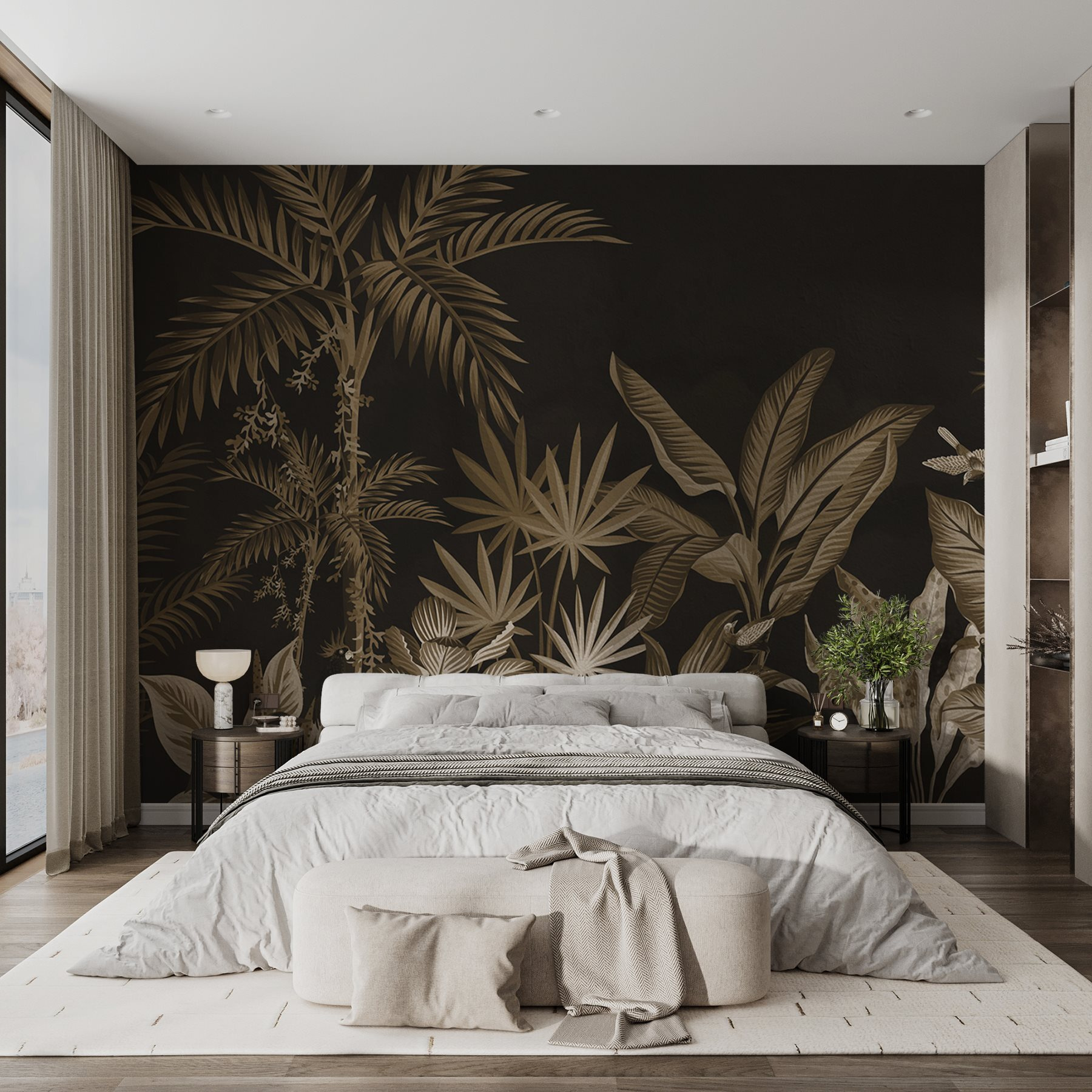 Transform any space into a tropical getaway with this stunning wall mural featuring elegant plants and leaves. Picture stepping into a lush jungle right from your living room—no need for a plane ticket! The rich, dark backdrop makes those golden-toned leaves pop, creating a cozy yet adventurous vibe. It’s like having a mini vacation without the hassle of packing. Imagine sipping your favorite drink, surrounded by nature’s beauty, and enjoying those calm, serene moments. This mural doesn’t just decorate; it invites a warm, welcoming atmosphere that’s hard to resist. Perfect for those who crave a touch of nature indoors!