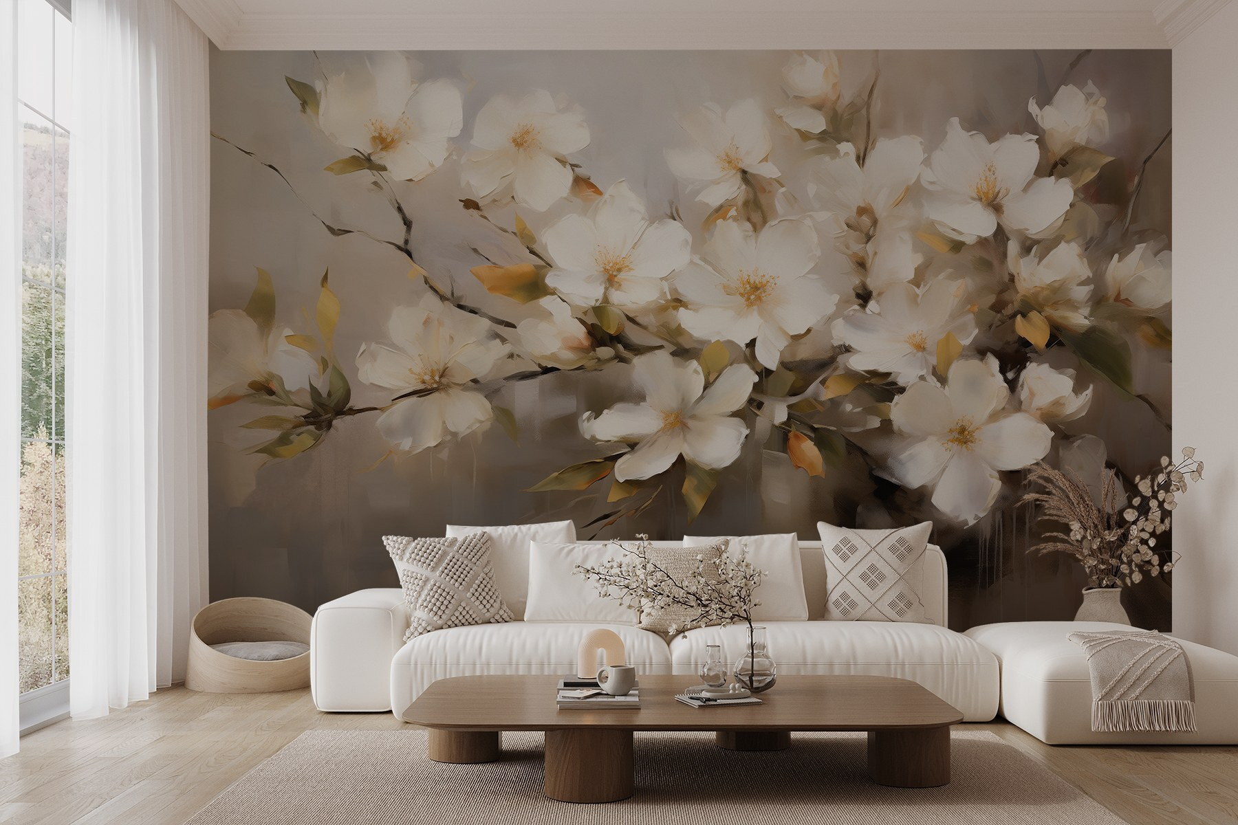 Transform any room into a serene escape with this lovely mural of white flowers. Just picture it—as you walk in, a gentle whisper of nature greets you, instantly calming the chaos of daily life. The soft peonies invite warmth and grace, making it feel like spring all year round. It’s like having your own Japanese garden, minus the pesky mosquitoes. Whether it’s for a cozy nook or a spacious living room, this mural wraps your space in an elegant embrace. Imagine sipping tea, surrounded by these blooms, feeling all kinds of inspired! Perfect for flower lovers or anyone needing a splash of tranquility.