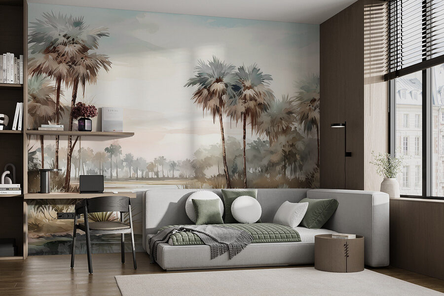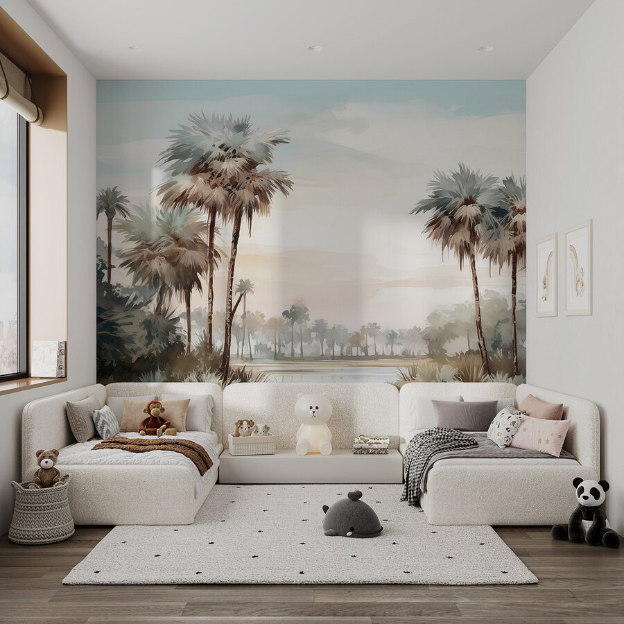 Dive into a slice of paradise with this “Water and Palm Trees by a River” mural. Just imagine it—waking up every morning to this tranquil scene, where the gentle sway of palms whispers sweet nothings. The soft colors—think sun-kissed warm hues—create a vibe that’s both calming and refreshing. It’s like your room just took a mini vacation, right? Perfect for a cozy reading nook or even your living room, this mural can transport anyone to a serene riverside without ever leaving home. Grab a cold drink, plop down, and let those good vibes roll in. Who wouldn’t want a piece of that chill energy?