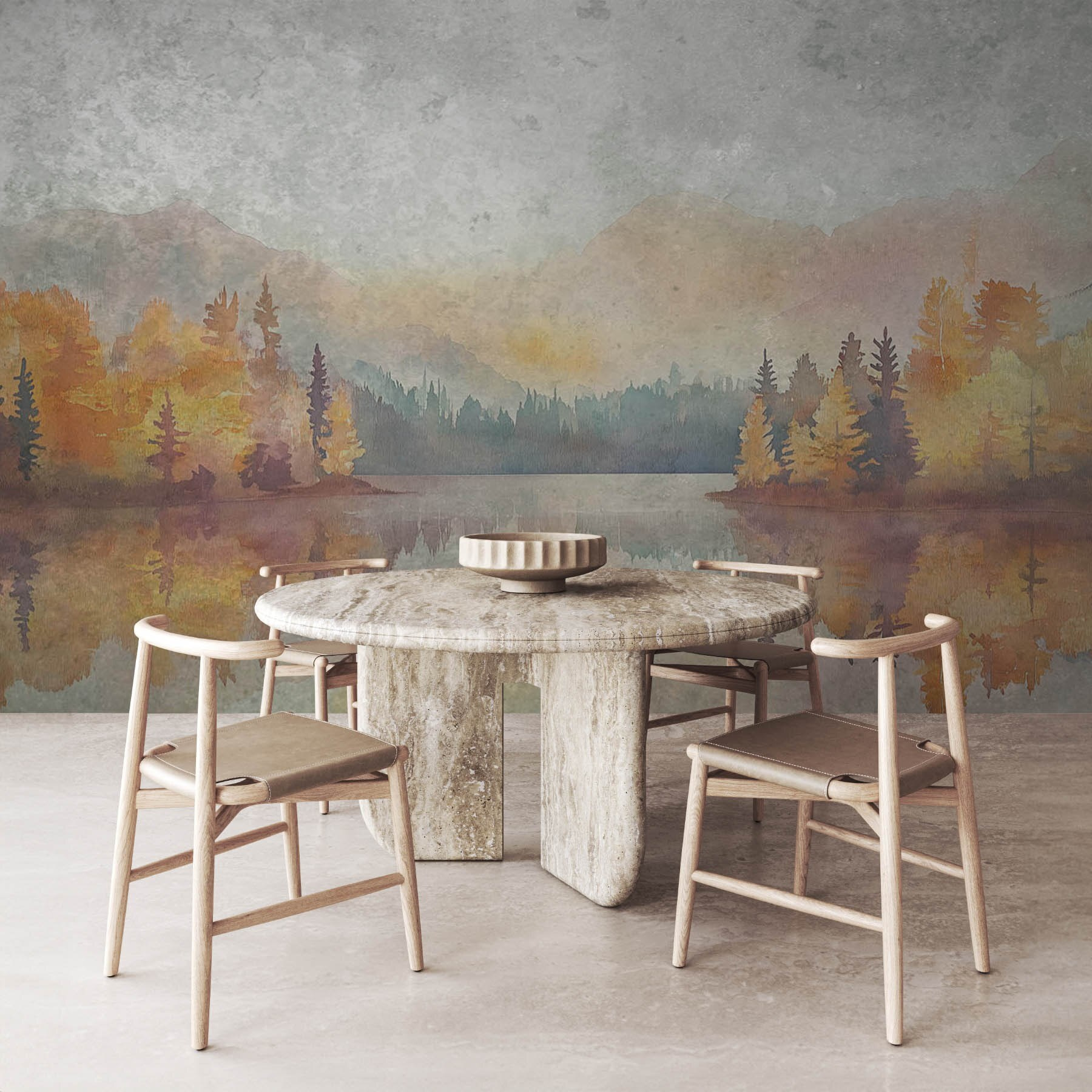 Transform your space with this enchanting watercolor mural—a serene lake embraced by vibrant trees and majestic mountains. Imagine sipping coffee while gazing at this peaceful scene, feeling the gentle rustle of leaves, and hearing the soft lapping of water. The warm hues invite cozy thoughts of autumn strolls, and the reflections might just inspire a daydream or two. Perfect for any room yearning for a pop of nature, this mural whispers tranquility. Who wouldn’t want a little slice of the outdoors, right there at home?