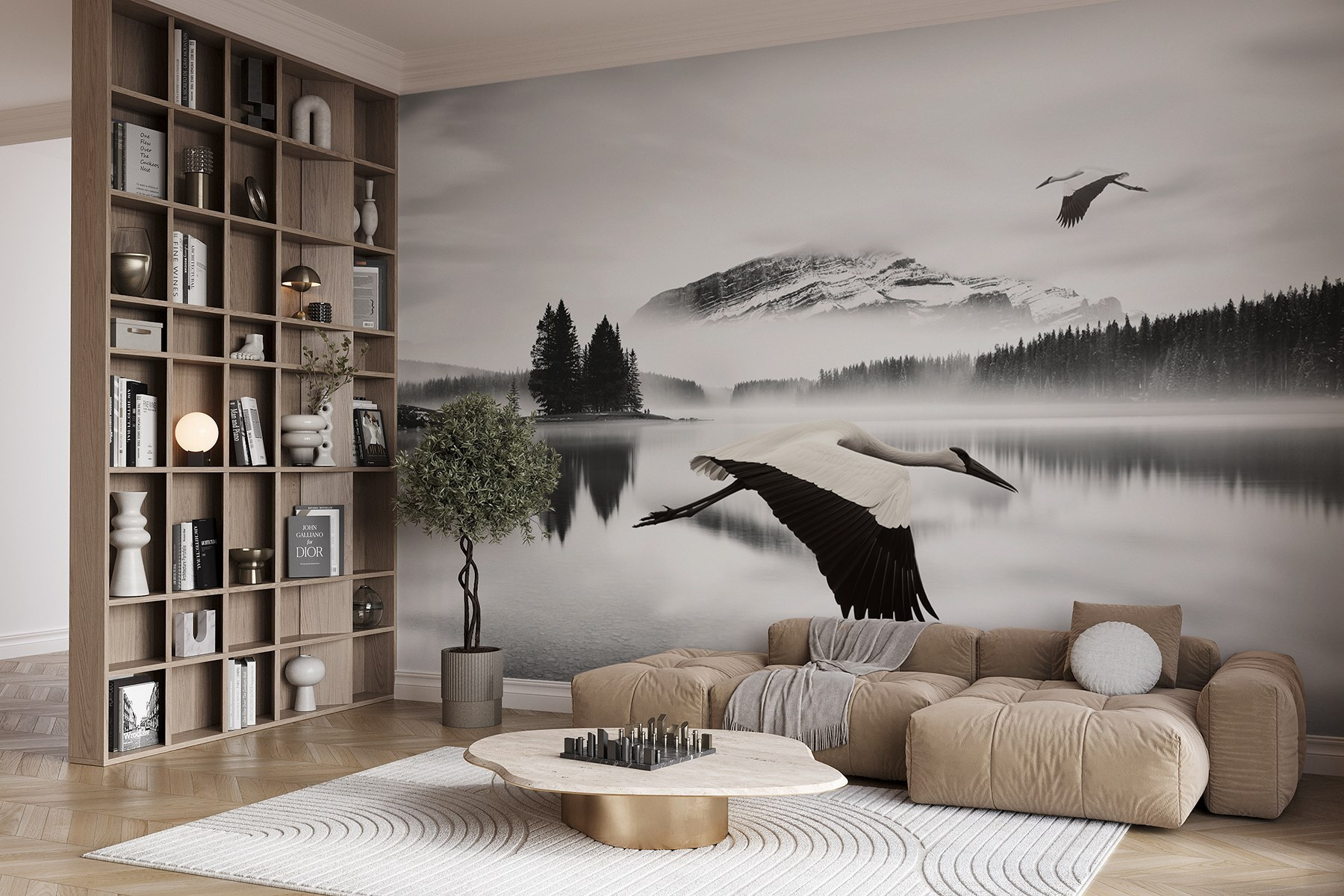 Imagine walking into a room that feels like a gentle escape, thanks to the “Bird Flying Over Water” mural. It captures a serene moment—one bird soaring gracefully above the stillness of a misty lake, surrounded by majestic trees and mountains. The calming grayscale palette adds a touch of sophistication, making it perfect for both cozy corners and chic spaces. Picture sipping tea, or maybe just daydreaming, while gazing at the mural. It’s like having nature right on your wall, whispering peace and tranquility into your daily hustle. This isn’t just decor; it’s an experience! Perfect for nature lovers or anyone needing a slice of calm in their life. Hang it up and let those worries drift away!