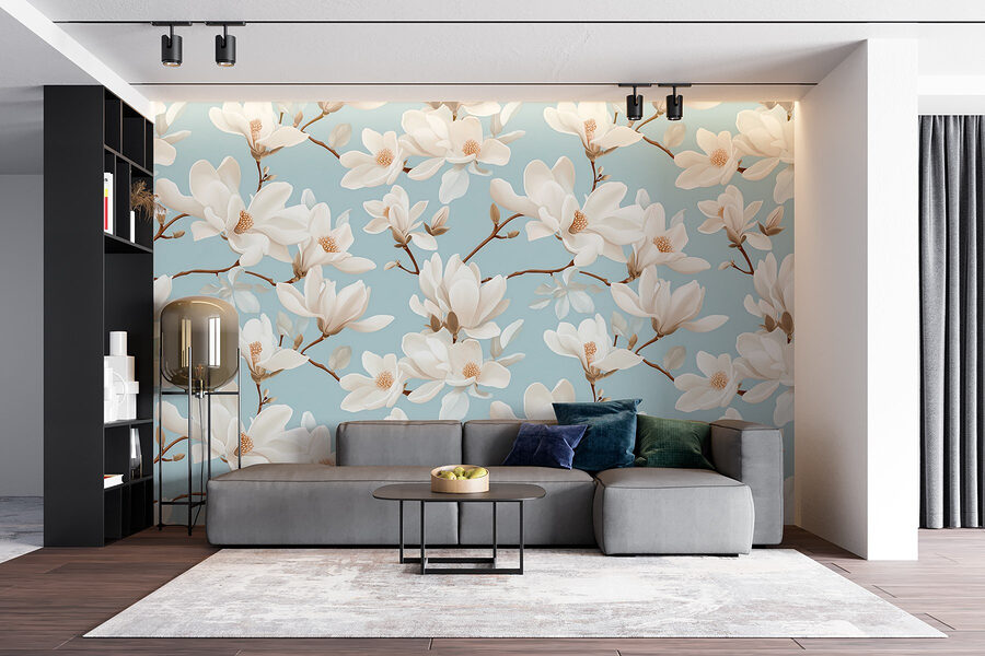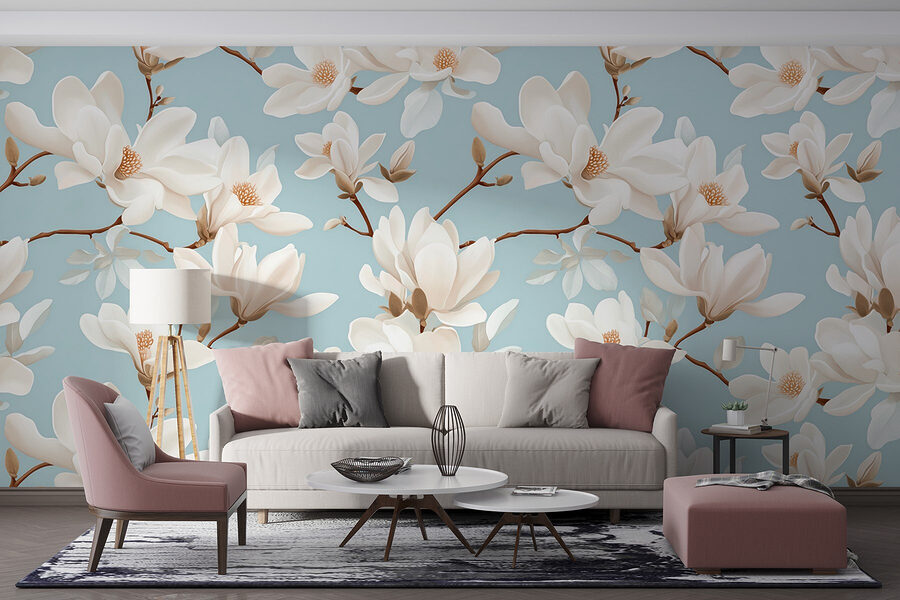 Transform your space with the stunning “Wall Murals Pattern of White Flowers.” Imagine stepping into a room where graceful magnolias bloom against a soothing sky blue backdrop. It’s like having spring in your home all year long! The delicate petals and soft colors create a calming vibe—perfect for unwinding after a long day or curling up with a good book. Friends will walk in and think you’ve secreted away to a lush garden! Plus, it’s a reminder that beauty can be just a wall away. Who knew home decor could feel so refreshing and cheerful?