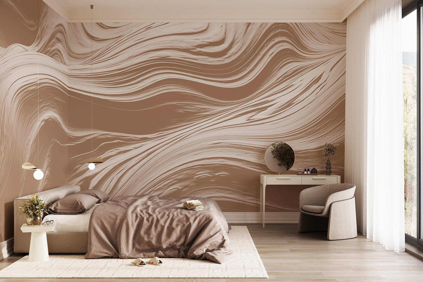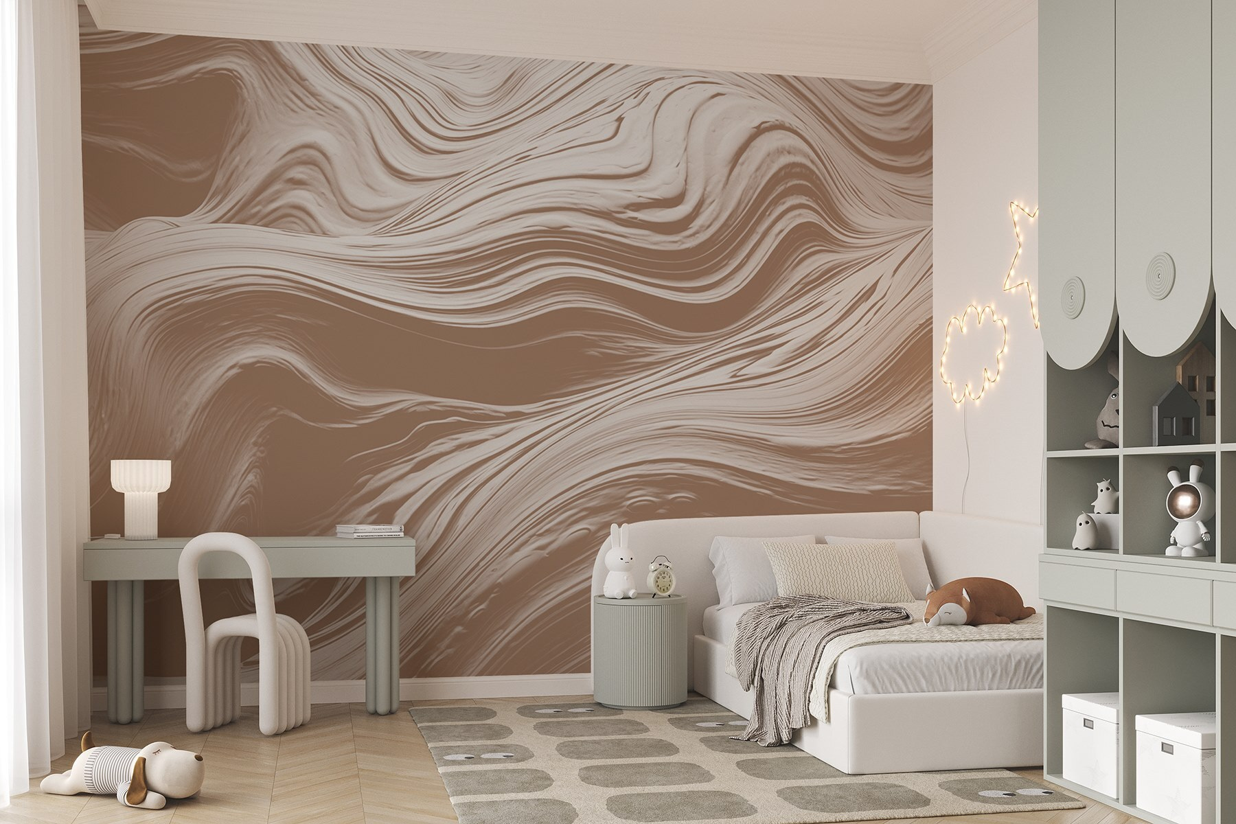 Imagine walking into a room and being greeted by gentle swirls that dance across the wall, pulling you into a serene embrace of soft hues. This mural is like a cozy hug for your space, radiating warmth and style. It’s perfect for those moments when you want to chill with a cup of tea or get lost in a good book—seriously, who wouldn’t want to spend time here?