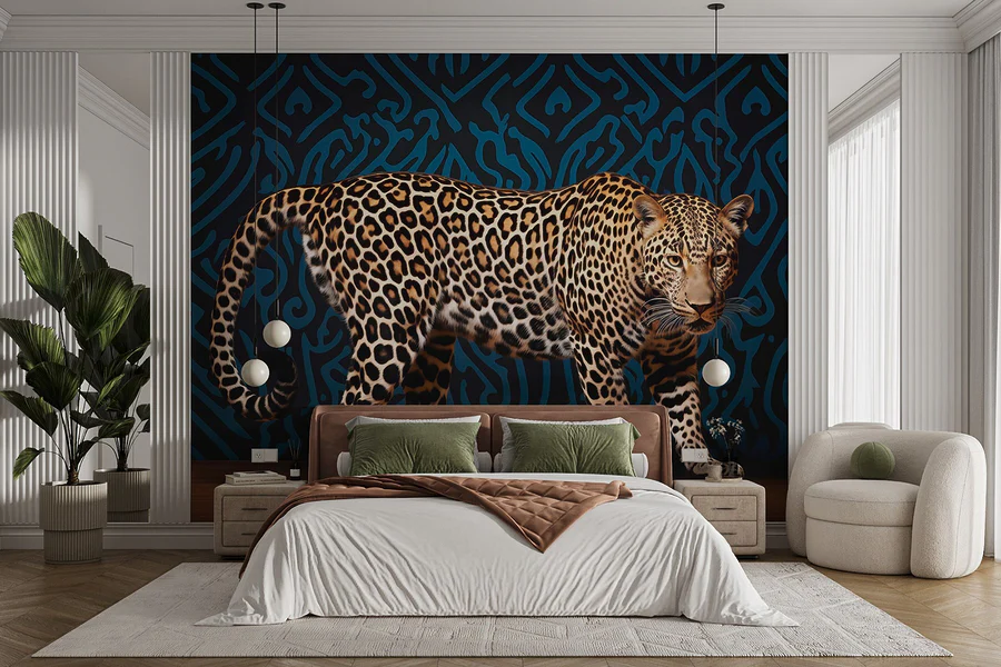 Transform a room into a vibrant jungle with this stunning leopard mural. Imagine walking into your living space and being greeted by that majestic creature, all sleek spots and confidence, as if it’s about to strut off the wall. The dynamic contrast of the blue patterns in the background adds a playful touch, too. Perfect for a cozy reading nook, it’s like inviting a bit of the wild right into your home. You might even find yourself chatting with it. This mural isn’t just decor; it’s a lively conversation starter. So, get ready to unleash some style!