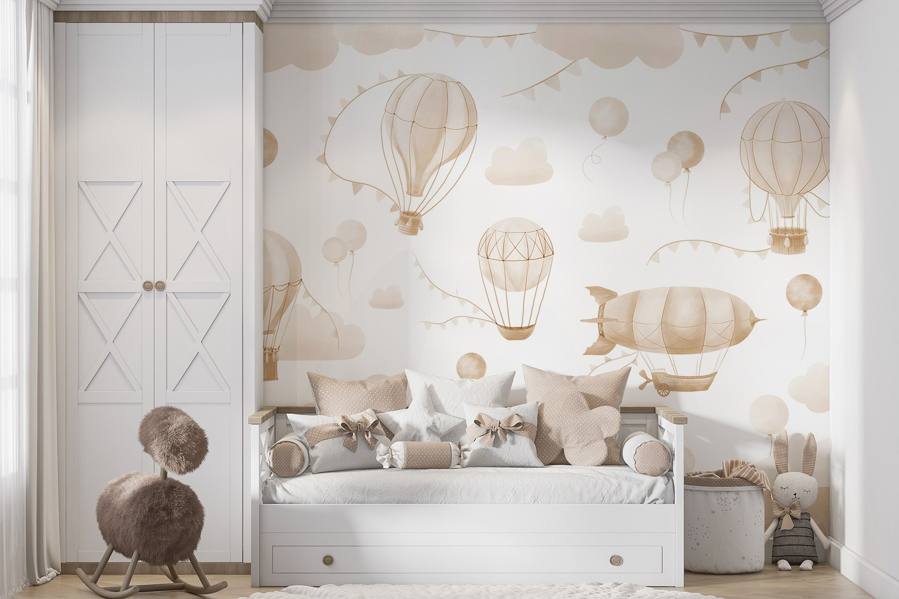 Transform any room with this enchanting mural of hot air balloons sailing over gentle mountains. Imagine sipping your morning coffee, gazing at whimsical balloons drifting lazily by. It’s like an invitation to daydream—no plane ticket required. The soft colors create a soothing atmosphere, making it perfect for a cozy living room or a child’s playful bedroom. Picture bedtime stories under this sky—adventures taking flight right from your walls. This mural doesn’t just decorate; it sparks joy and curiosity, adding a touch of wonder that lingers long after the day is done.