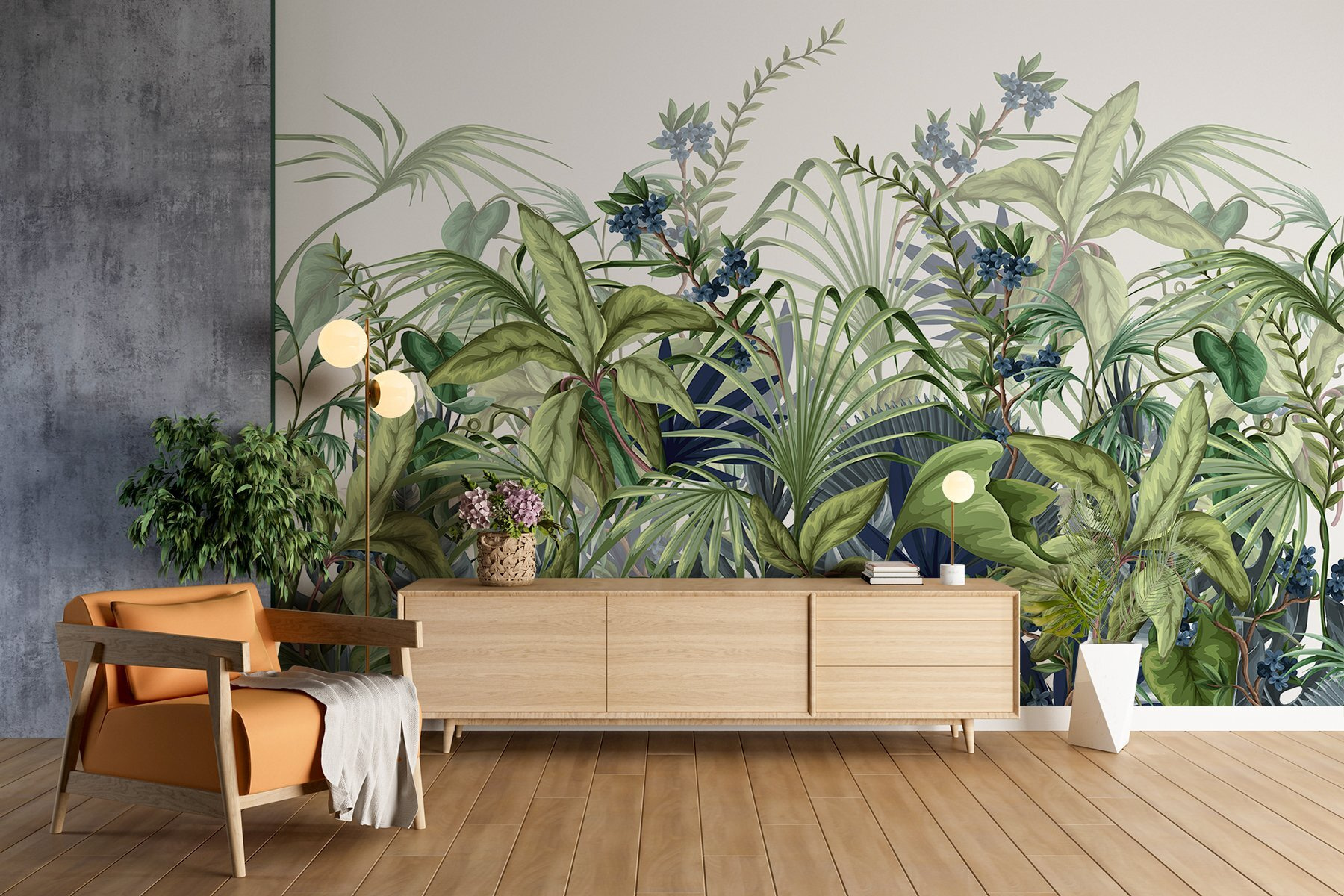 Transform your space into a serene sanctuary with this vibrant wall mural, “Lush Greenery Creates a Tranquil Vibe.” Imagine walking into a room where lush leaves and delicate blooms greet you every day—talk about instant calm! This design brings the fresh zing of nature indoors, making even a Monday feel like a cozy weekend escape. The mix of lively greens and soft blues creates a backdrop that whispers relaxation. Guests might be convinced you’re living in a tropical paradise. Plus, who wouldn’t want to feel like they’re surrounded by a mini-forest while sipping morning coffee? Perfect for any space needing a touch of warmth, it’s like a little slice of nature’s wonder right on your wall!