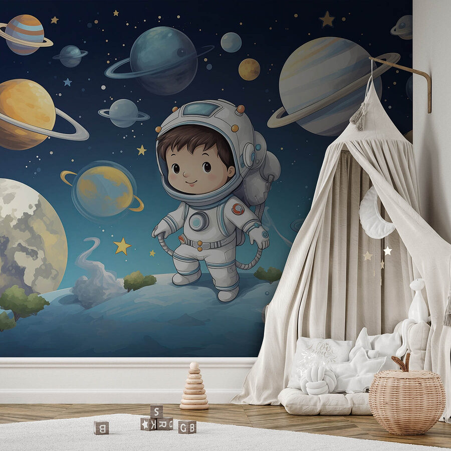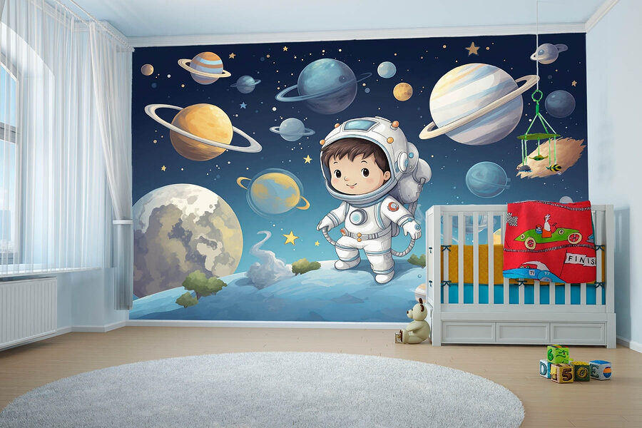 Blast off to adventure with this delightful wall mural featuring an adorable boy in a space suit! Picture this: a room transformed into a cosmic playground where imaginations can soar higher than Saturn’s rings. The vibrant colors capture the enchanting beauty of the galaxy. Little ones can dream big, floating among planets and stars that spark curiosity and joy! Whether it’s for a nursery or a playroom, this mural adds whimsy and a splash of cosmic magic. Who wouldn’t want to chase meteors while munching on snacks? It’s like having a mini astronaut ready for interstellar fun right on the wall!