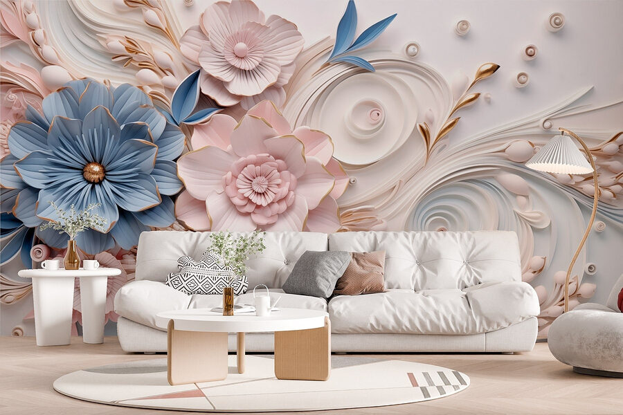 Transform your space into a delightful garden with this stunning mural featuring paper flowers and leaves. It’s like bringing a burst of spring indoors, minus the sneezing from pollen! Imagine stepping into your room and being greeted by lush blooms that just seem to dance along the wall. The soft colors—blues and pinks mingling with creamy whites—create a calming atmosphere, perfect for unwinding after a long day. It adds a touch of whimsy, perfect for cheerful vibes whether it’s in a cozy living room, a nursery, or even a chic office nook. Every glance at this mural is like a little reminder to stop and smell the flowers, ideally while sipping your favorite drink!