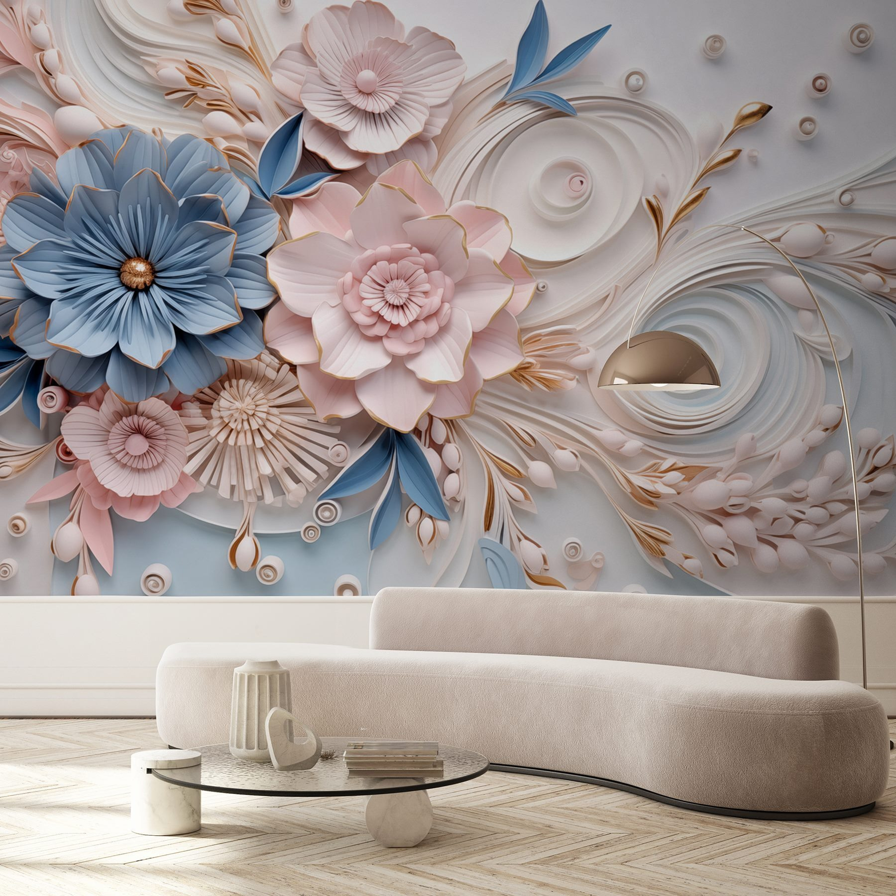Transform your space into a delightful garden with this stunning mural featuring paper flowers and leaves. It’s like bringing a burst of spring indoors, minus the sneezing from pollen! Imagine stepping into your room and being greeted by lush blooms that just seem to dance along the wall. The soft colors—blues and pinks mingling with creamy whites—create a calming atmosphere, perfect for unwinding after a long day. It adds a touch of whimsy, perfect for cheerful vibes whether it’s in a cozy living room, a nursery, or even a chic office nook. Every glance at this mural is like a little reminder to stop and smell the flowers, ideally while sipping your favorite drink!