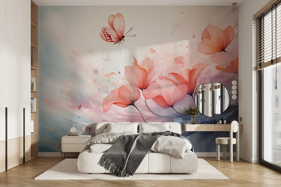 Transform your space into a tranquil haven with this enchanting wall mural featuring a butterfly gracefully fluttering over delicate flowers. The soft hues and watercolor effects create a dreamy backdrop, instantly lightening the mood. Imagine sipping tea, daydreaming, or just stealing glances at this beauty while wrapped in your favorite blanket. It’s like bringing a garden indoors without the pesky pollen! This mural whispers serenity, making it perfect for a cozy nook or a bright living room. Who wouldn’t want to feel like they’re in a breezy meadow every day?