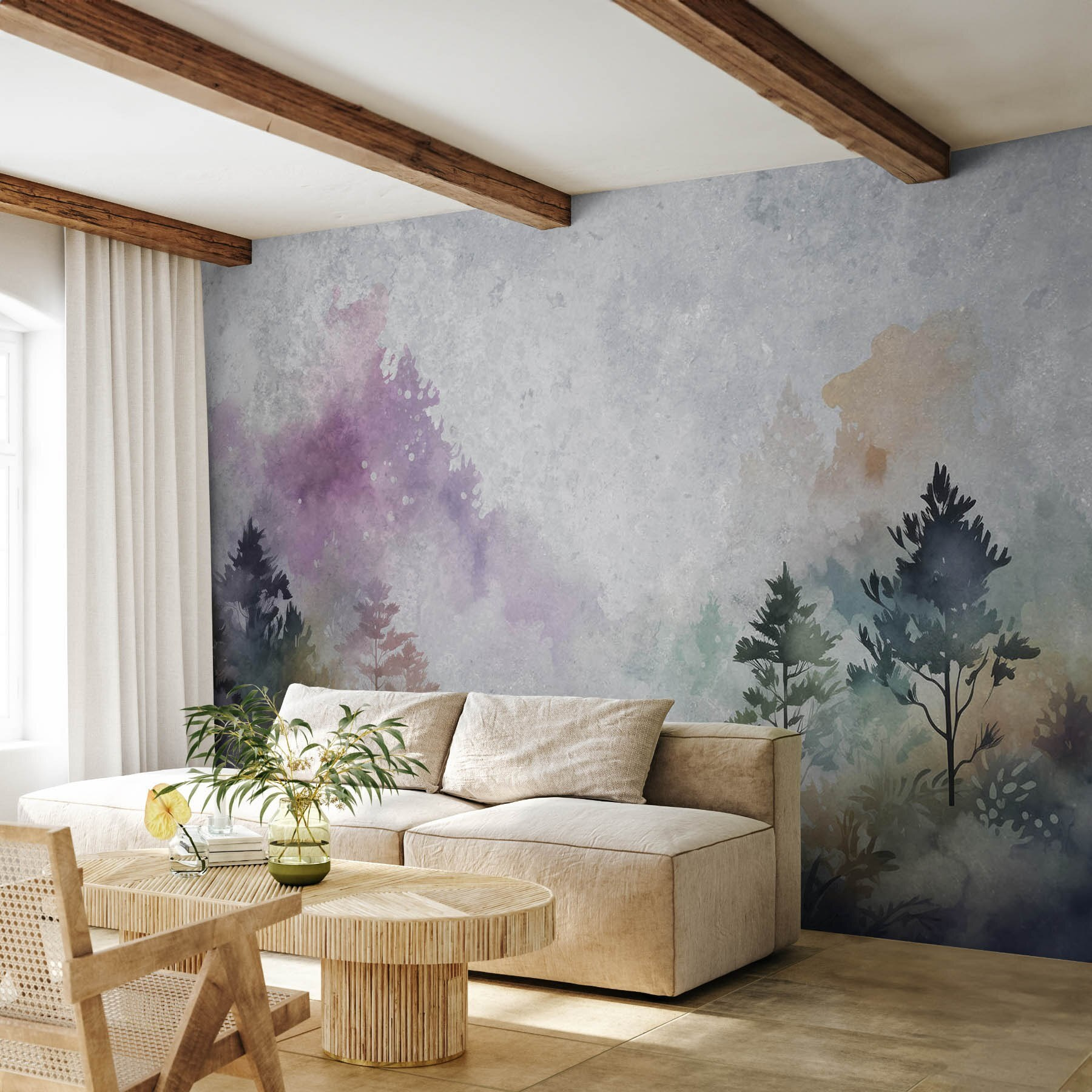 Transform a dull wall into a dreamy escape with this stunning mural of trees and bushes. Picture walking through a misty forest, where every glance invites calm and tranquility. This watercolor mural brings nature indoors, blending soft greens with tranquil purples, creating a serene backdrop for any room. Imagine curling up with a good book, feeling like you’re nestled in a forest retreat. It’s like your personal slice of nature, minus the bugs and muddy shoes. Perfect for living rooms, bedrooms, or that cozy reading nook just waiting for a little lush magic.