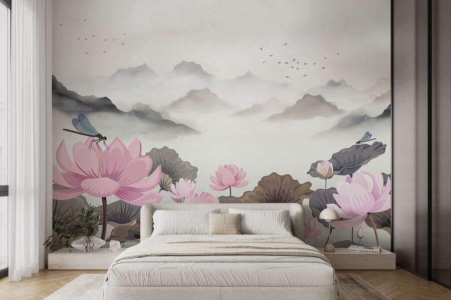 Transform any room into a serene escape with this enchanting mural of flowers and water. Picture it: you walk in, and suddenly, you’re greeted by soft pink lotus flowers gently swaying, surrounded by lush greenery and a misty backdrop. It’s like bringing a piece of nature right into your living space! Imagine sipping your morning coffee, feeling as though you’re lounging by a tranquil pond. This mural invites a sense of calm and beauty, perfect for unwinding after a long day. Those little dragonflies? They add a whimsical touch that keeps your gaze wandering. Bring some peace to your walls—because who wouldn’t want a daily reminder of nature’s charm?