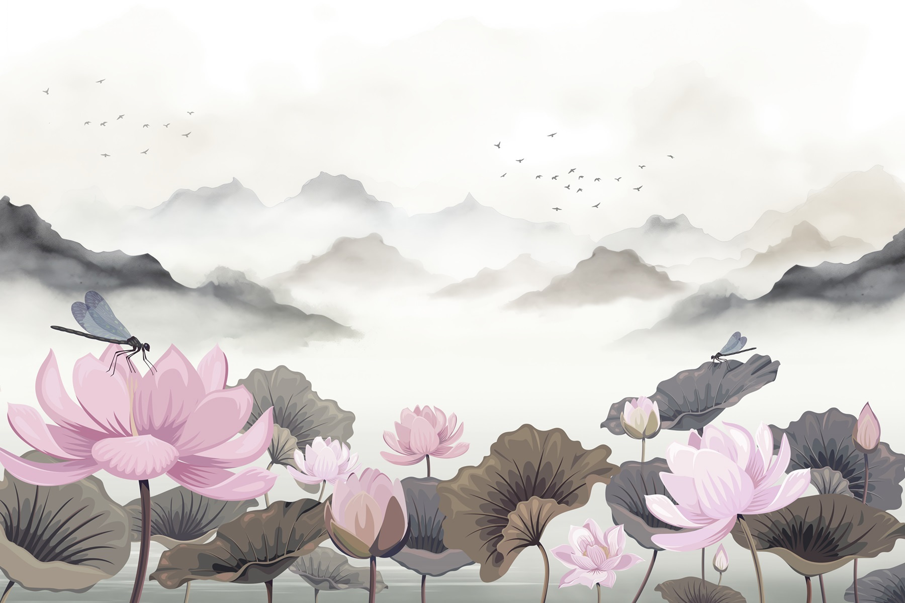 Transform any room into a serene escape with this enchanting mural of flowers and water. Picture it: you walk in, and suddenly, you’re greeted by soft pink lotus flowers gently swaying, surrounded by lush greenery and a misty backdrop. It’s like bringing a piece of nature right into your living space! Imagine sipping your morning coffee, feeling as though you’re lounging by a tranquil pond. This mural invites a sense of calm and beauty, perfect for unwinding after a long day. Those little dragonflies? They add a whimsical touch that keeps your gaze wandering. Bring some peace to your walls—because who wouldn’t want a daily reminder of nature’s charm?