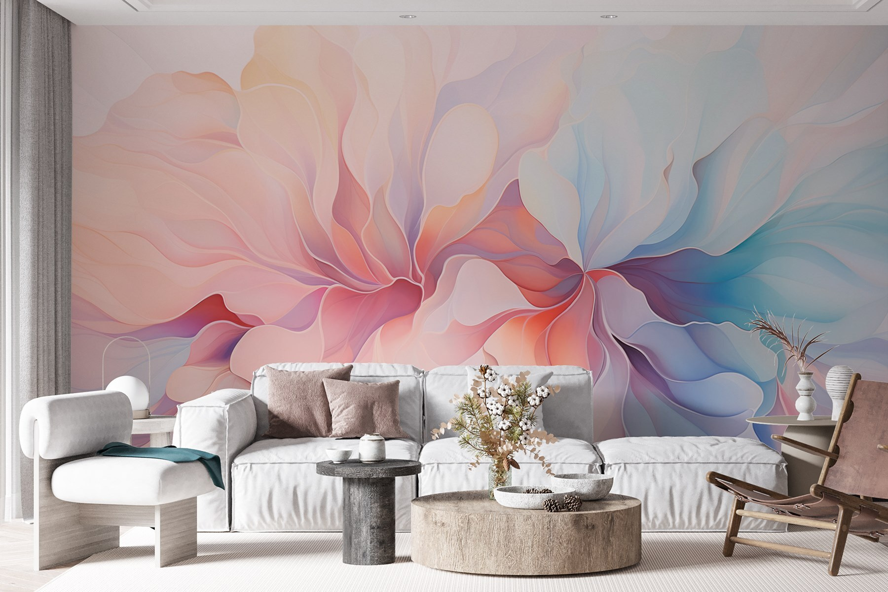 Transform your space with “Soft Hues in Delicate Harmony.” This mural brings an airy, dreamy vibe, showering walls with gentle pastels that feel like a warm embrace. Imagine walking into a room that feels like a breath of fresh air—fancy, right? The flowing shapes mimic petals dancing in a light breeze, sending your imagination twirling. It’s perfect for those cozy reading nooks or that spot where one tends to sip coffee while pondering life’s big questions. Surround yourself with beauty, and let your walls tell a story that makes everyone feel right at home. Seriously, who doesn’t want that?