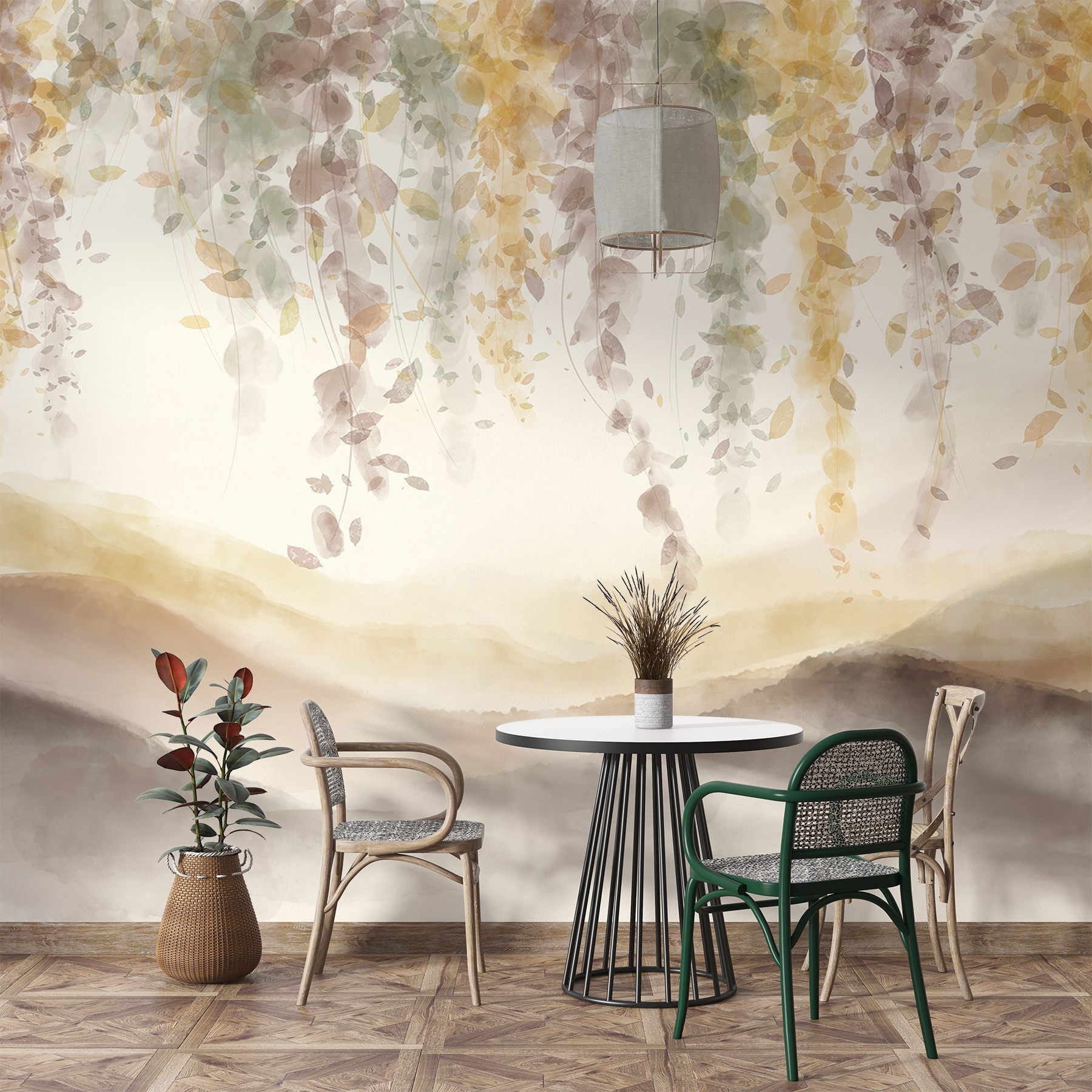 Transform your space with this enchanting mural that brings the beauty of nature indoors. Picture a dreamy landscape where soft leaves dance from the ceiling—perfect for cozy corners or as a statement piece. The gentle watercolor hues blend seamlessly, making it feel like a warm embrace from Mother Nature herself. Imagine sipping tea while lounging beneath these delicate vines, daydreaming of sunny days. It’s like having a slice of the outdoors right in your living room, minus the ants. So go ahead, let this mural add a touch of whimsy and tranquility to your home.