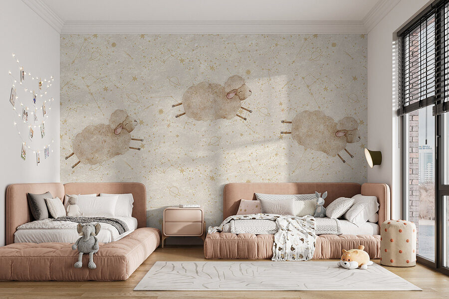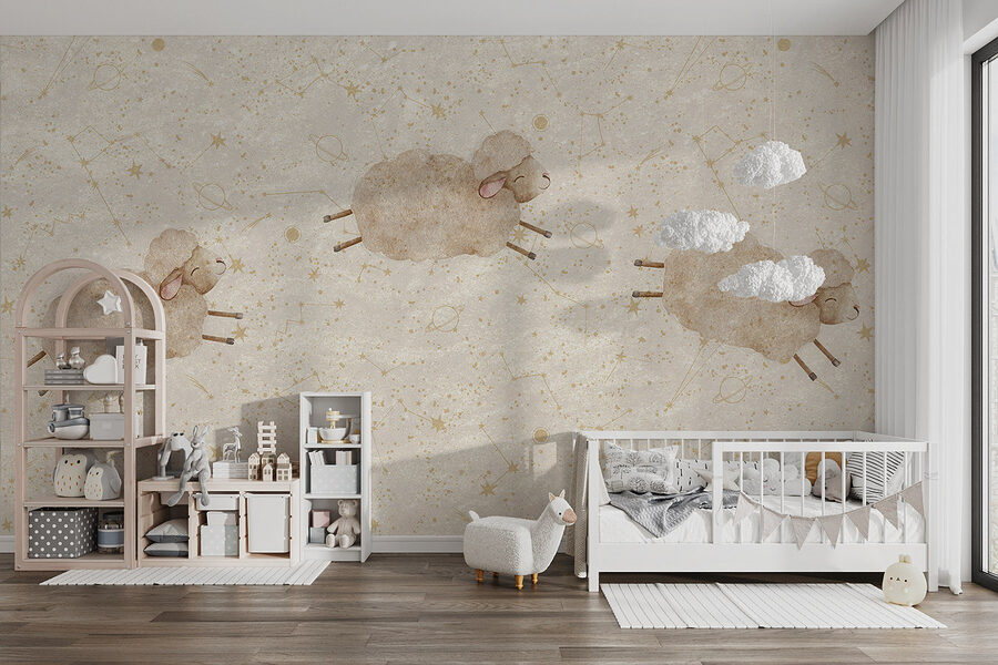 Transform any space into a cozy haven with this delightful mural featuring a whimsical flock of sheep frolicking across a soft white background. It’s like inviting a piece of the countryside right into your home. Perfect for nurseries or playrooms, these charming little rams appear ready for an adventure—perhaps star-gazing or just daydreaming under a warm sky. They bring a subtle warmth that adds comfort and joy, making it hard not to smile every time you look up. Imagine a child pointing and giggling at their new woolly friends, creating memories that’ll last a lifetime. Perfect for adding a touch of cheer without overwhelming the room!