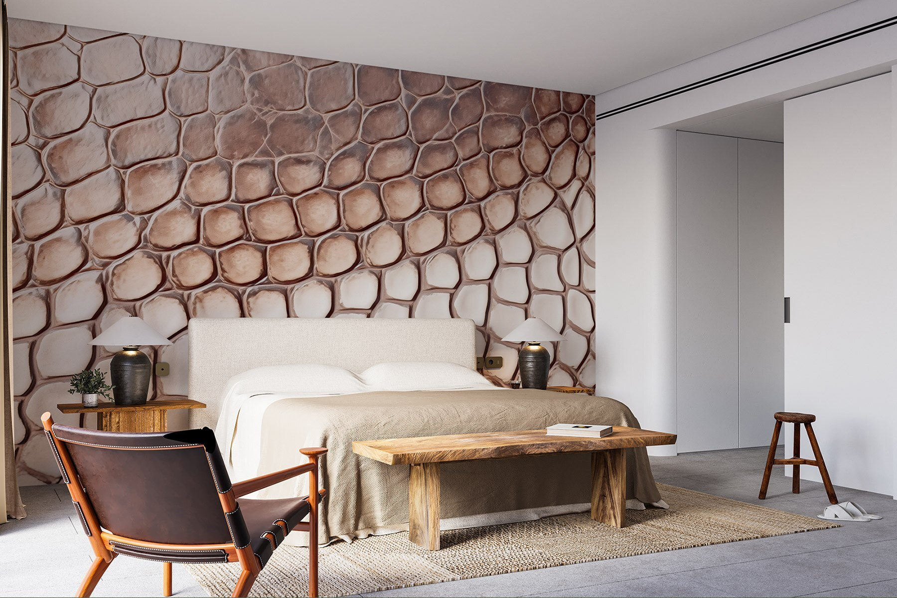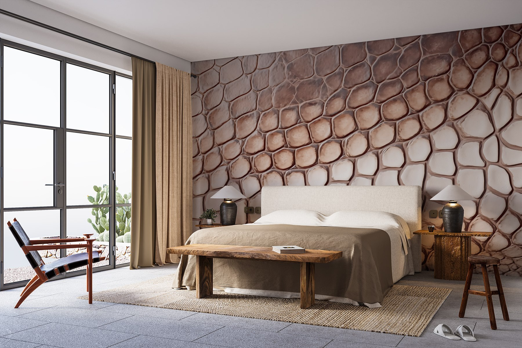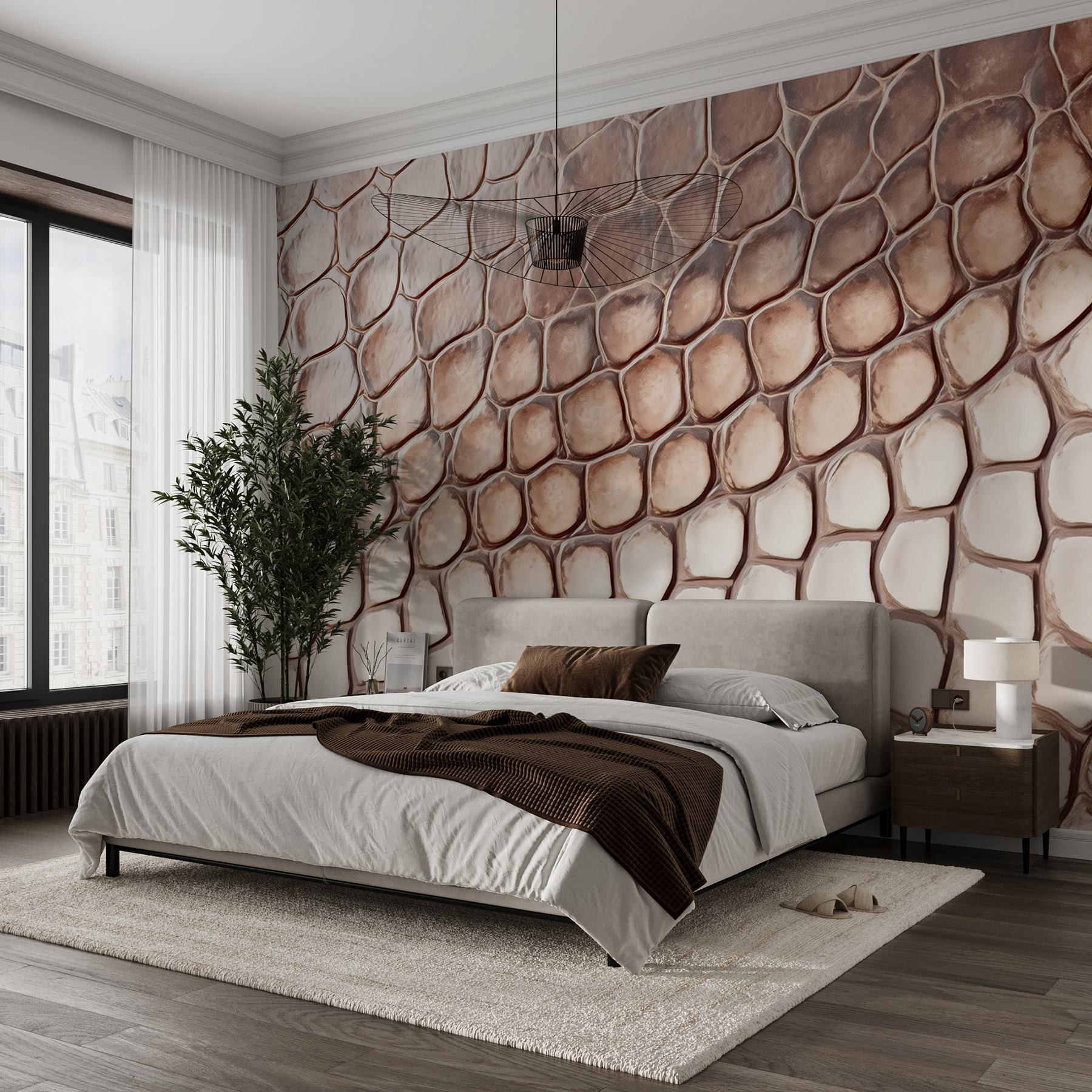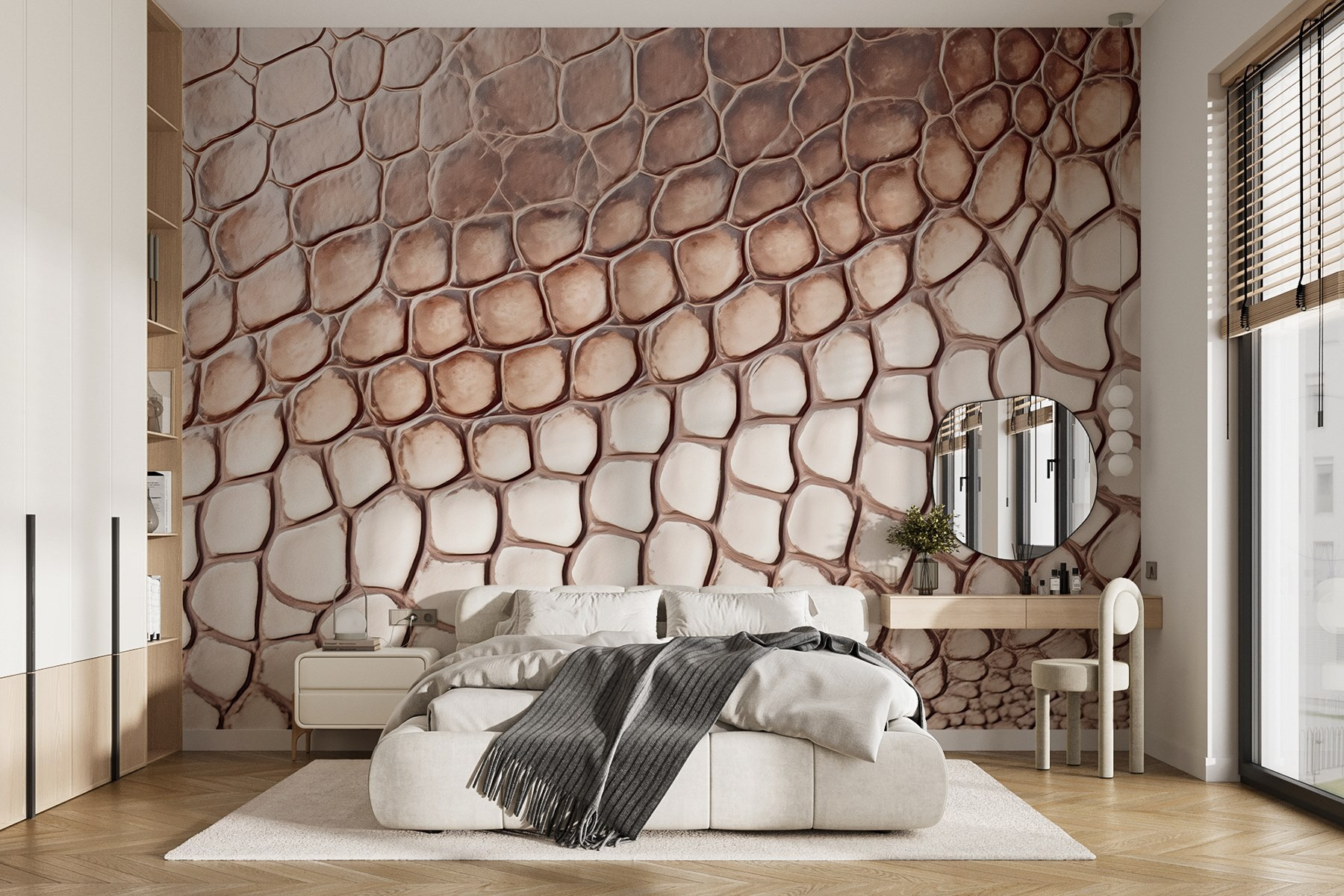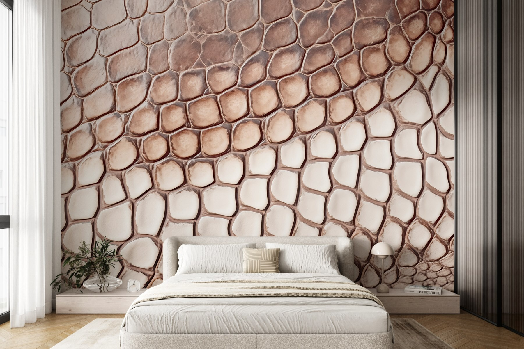 Transform any space into a head-turning adventure with this wall mural showcasing a reptile skin pattern. Imagine walking into a room where the walls are alive, effortlessly bringing a touch of the wild right into your home. The organic shapes and soft hues will have guests doing a double-take, wondering if they’ve stepped into a luxury safari lodge. It’s not just decor—it’s a vibe! Pair it with some lush green plants, and you’ve got yourself an oasis. Perfect for someone looking to add a unique twist without going overboard. Let the walls do the talking!