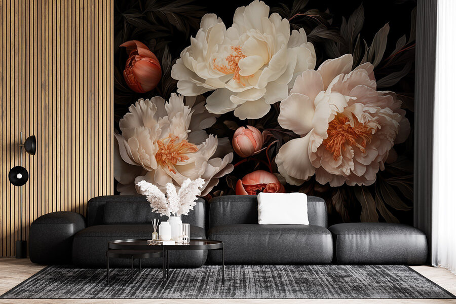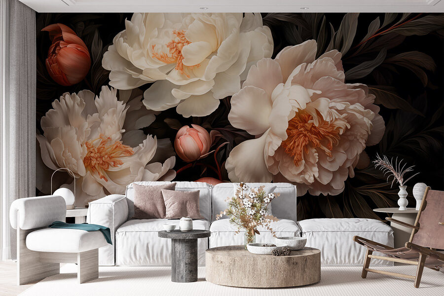 Transform any wall into a blooming haven with this stunning mural featuring a delightful ensemble of white and blush peonies. Imagine walking into a space where the soft petals seem to whisper sweet tales of springtime, all year round. It’s like having a garden party right on your wall, minus the bees buzzing around—thank goodness for small favors! The deep, rich backdrop enhances the flowers’ natural elegance, setting a warm, inviting mood. Perfect for creating a cozy reading nook or adding a touch of romance to a dining area, this mural brings a splash of nature indoors. It’s a gentle reminder that beauty can be found everywhere, even in your living room.