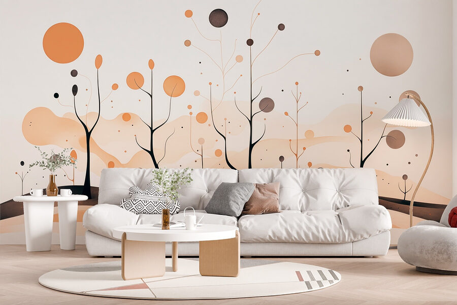 Transform any space with this playful wall mural featuring trees and plants in an abstract style. It’s like bringing a little forest indoors, without the need for a shovel or watering can. The soothing hues of orange and brown mingle beautifully, sparking a sense of calm that feels just right for a cozy living room or a laid-back bedroom. Imagine how great it’d be to sip coffee here, feeling the gentle vibe as if nature itself is right beside you. It’s all about creating that peaceful escape, where each glance at the mural lifts the mood—perfect for unwinding after a long day or impressing guests. Plus, it adds a touch of fun that’s a bit unexpected yet so refreshing!