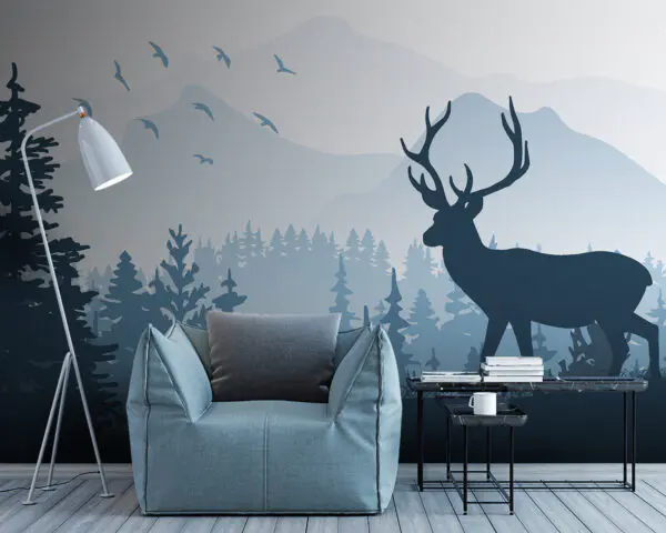 Wall murals Snowy mountain landscape with trees and a bird flying over it
